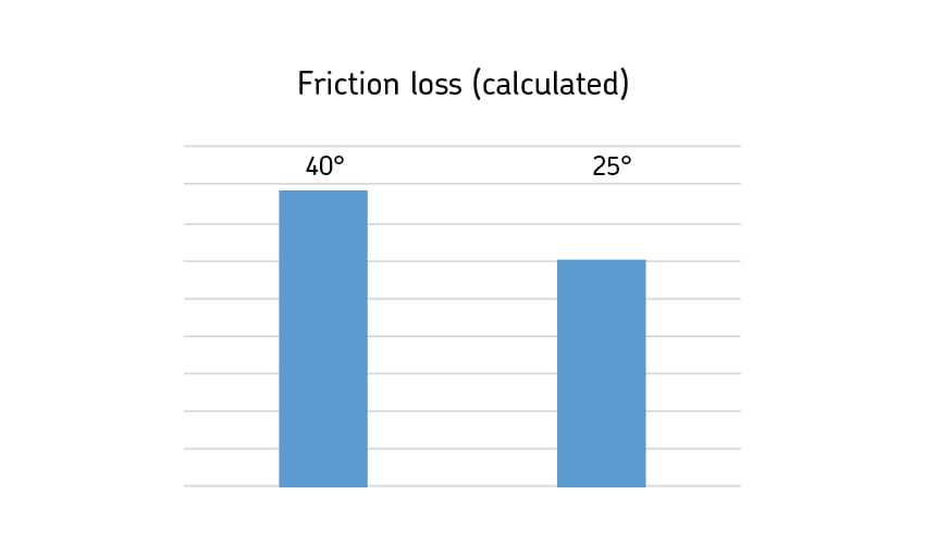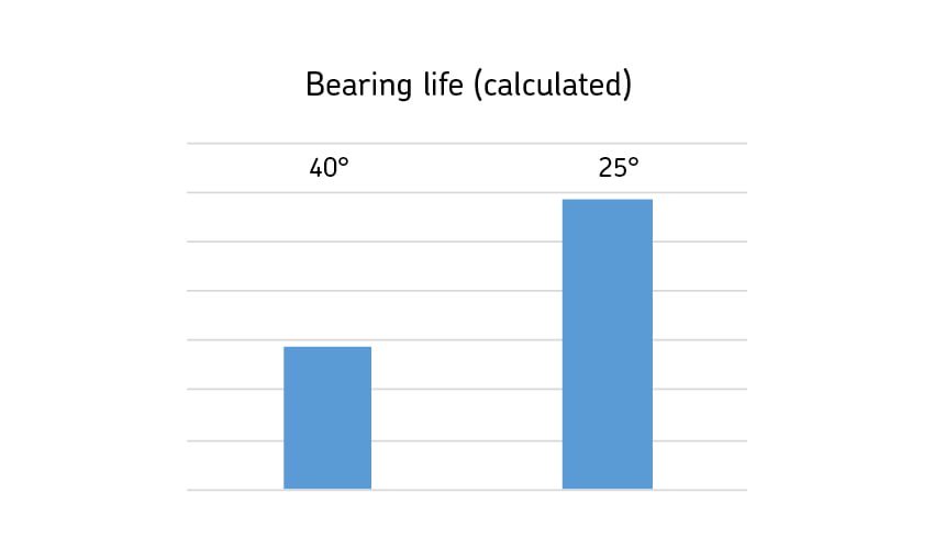 Tốc độ của các máy bơm chân không được phân tích cao hơn so với các máy nén trục vít có kích thước tương tự, trong khi tải lực đẩy thấp hơn một chút. Các phân tích cho thấy lựa chọn thiết kế tốt nhất là bố trí ổ trục kép kết hợp ổ trục SKF Explorer mới với góc tiếp xúc 25 ° và khe hở nhẹ. Kết quả tính toán được hiển thị trong biểu đồ dưới đây chứng minh rõ ràng sự khác biệt về hiệu suất khi nói đến tuổi thọ tính toán và giảm tổn thất điện năng.